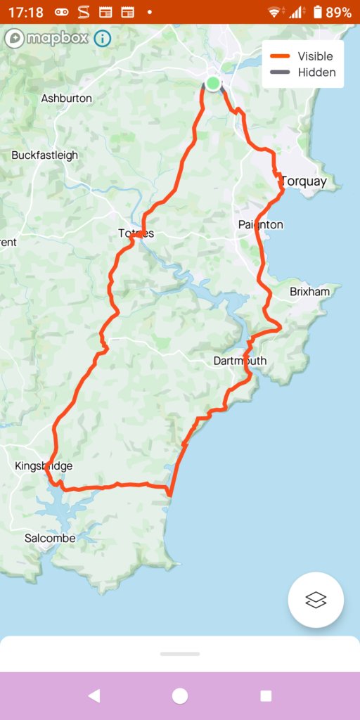まずは、家から14㎞先にあるTotnesとういうこの辺りではヒッピーの街として有名な所の街中の坂道を登っていきます。そこから、坂道、(A381)をまた登って下って21km先に有るのがKingsbridgeという町です。この辺りは、海の入り江があって富裕層が住んでいる町ですが、大きな都市に出るのには時間がかかるので、定年退職した方々が都会から引っ越してきていらっしゃいます。